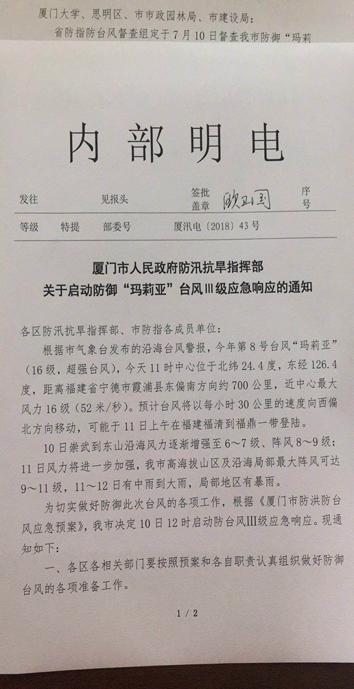 附:廈門市人民政府防汛抗旱指揮部關(guān)于啟動(dòng)防御“瑪利亞”臺(tái)風(fēng)III級(jí)應(yīng)急響應(yīng)的通知