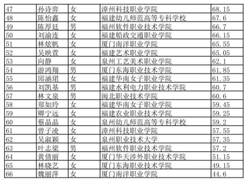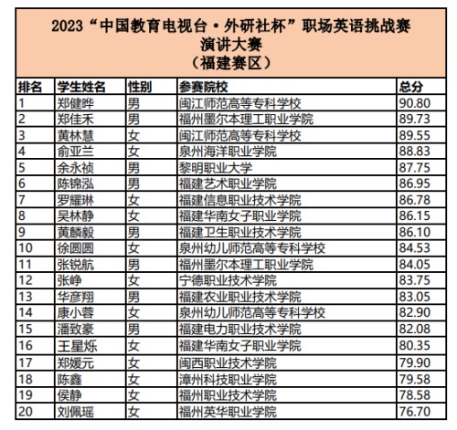 根據(jù)2023年“中國教育電視臺?外研社杯”職場英語”挑戰(zhàn)賽福建賽區(qū)決賽結(jié)果,現(xiàn)將演講、寫作選手成績公示如下,公示期限為三個(gè)工作日。公示期結(jié)束后將發(fā)布兩個(gè)賽項(xiàng)的獲獎情況以及晉級國賽的院校和選手。