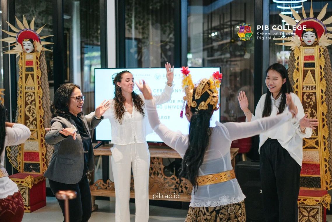 2025年4月25日,帶隊老師李薇(右一)與巴厘島理工學院Erika(左一)在研學結營典禮一起跳舞