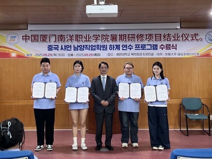 2025年5月29日,韓國世翰大學校長在研學結營儀式中為學生陳可卿(左二)頒發結業證書