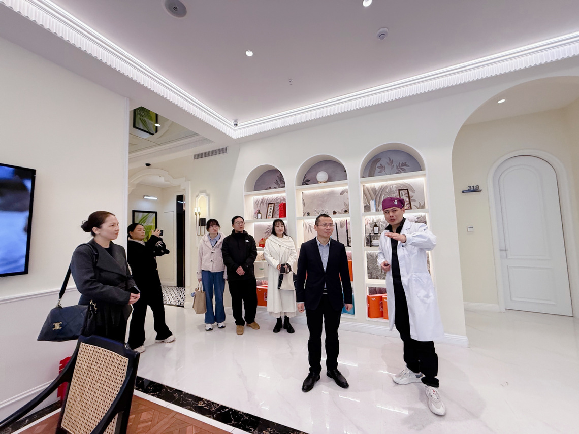 鐘石根一行參觀了醫院檢測區、手術區、護理區、服務區等核心功能區域。汪孟成介紹了微針植發診療全流程、核心技術應用要點及護理服務標準,讓參訪人員更直觀掌握企業用人需求。