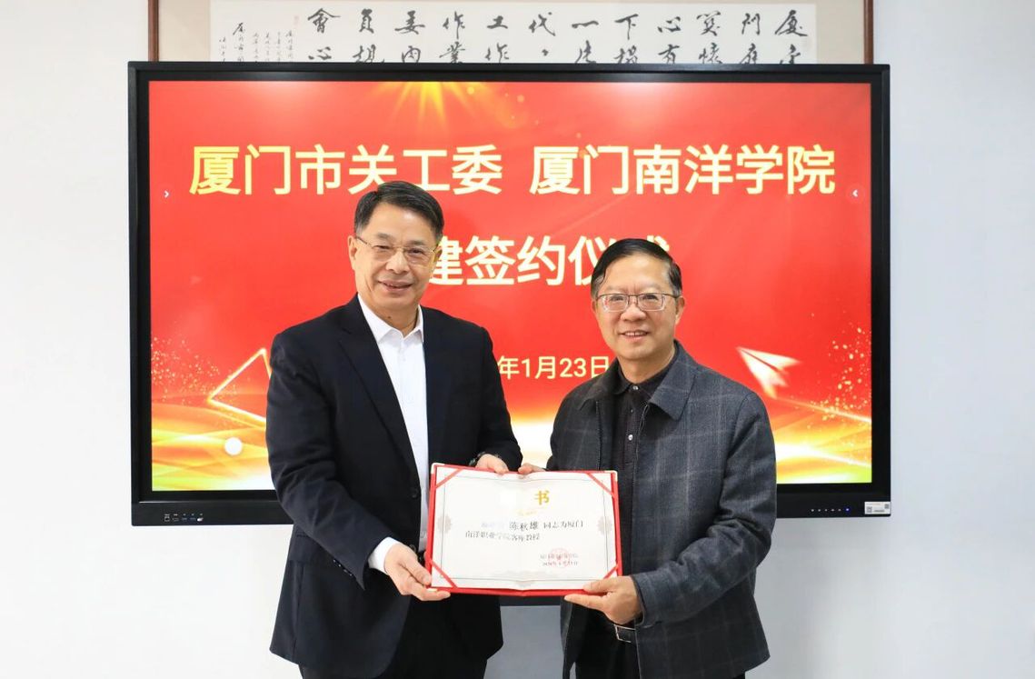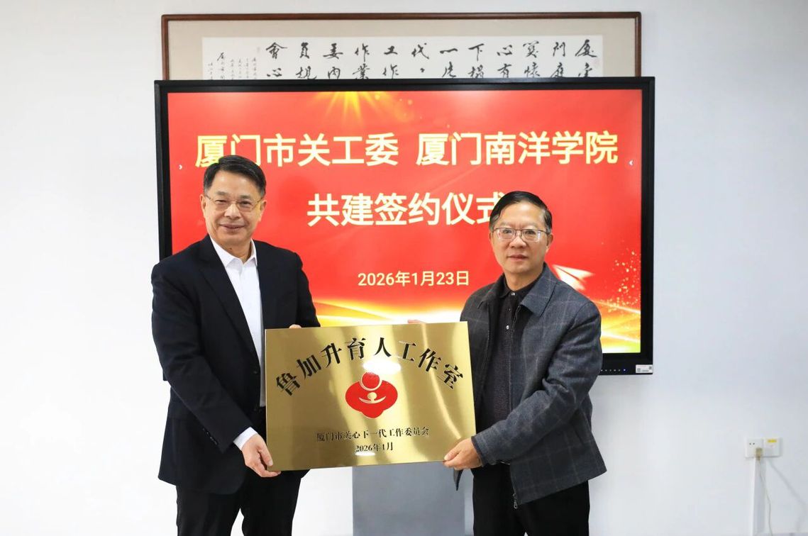 1月23日,廈門市關(guān)心下一代工作委員會(以下簡稱“市關(guān)工委”)與我校簽訂共建合作協(xié)議,市關(guān)工委主任、市委原副書記陳秋雄向我校創(chuàng)辦人魯加升教授授予“魯加升育人工作室”牌匾,我校向陳秋雄頒發(fā)客座教授聘書。