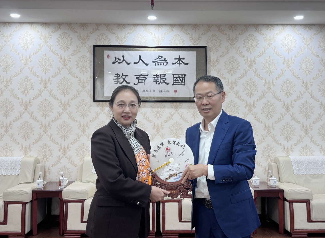 本次交流期間,廈門市江蘇商會會長張元慶代表商會向我校贈送商會定制禮品,董事長魯曉芹代表學校接受贈禮。