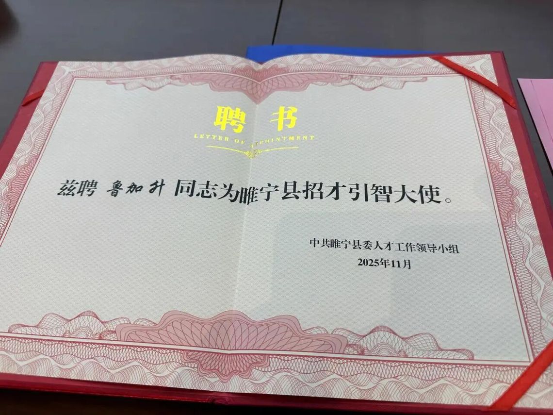 2025年11月,中共睢寧縣委人才工作領導小組向魯加升頒發“睢寧縣招才引智大使”聘書。