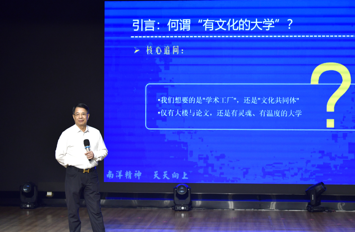 魯加升教授從大學(xué)文化的歷史根基與時(shí)代命題、大學(xué)文化的核心要素與運(yùn)行邏輯、廈門南洋學(xué)院的文化建設(shè)探索、大學(xué)文化的未來(lái)圖景四個(gè)方面,結(jié)合自身40余年教育實(shí)踐經(jīng)驗(yàn),系統(tǒng)闡述了大學(xué)文化建設(shè)的精神內(nèi)涵與發(fā)展方向,用鮮活的辦學(xué)案例、深刻的教育思考,激發(fā)了在場(chǎng)教職工的強(qiáng)烈共鳴與深入思考。他開篇點(diǎn)題,強(qiáng)調(diào)“文化是一個(gè)大學(xué)最根本的競(jìng)爭(zhēng)力”,為整場(chǎng)講座奠定了鮮明的基調(diào)。