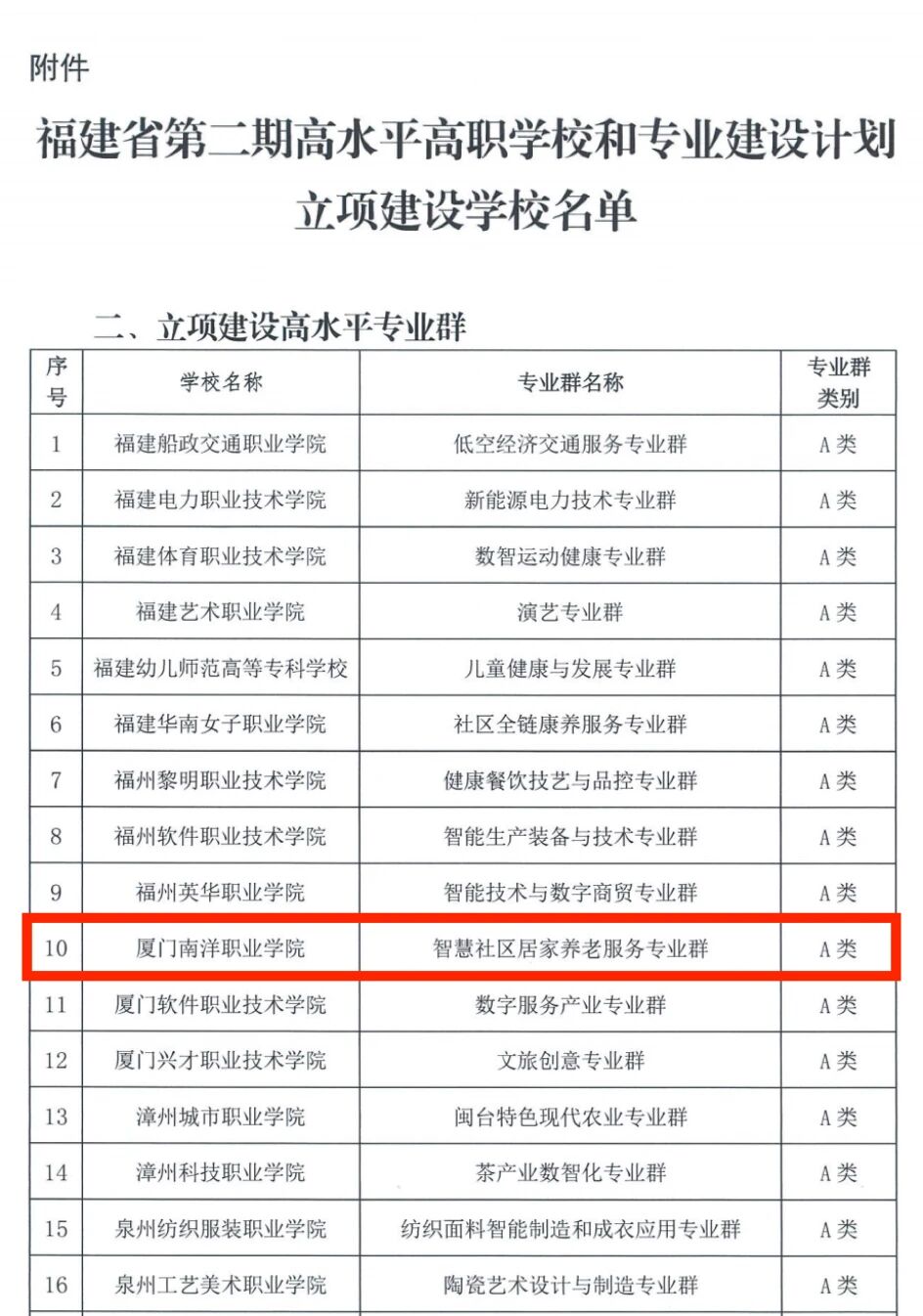 近日,福建省教育廳、財政廳公布第二期高水平專業建設計劃立項建設學校名單,廈門南洋職業學院醫學院智慧社區居家養老服務專業群入選。